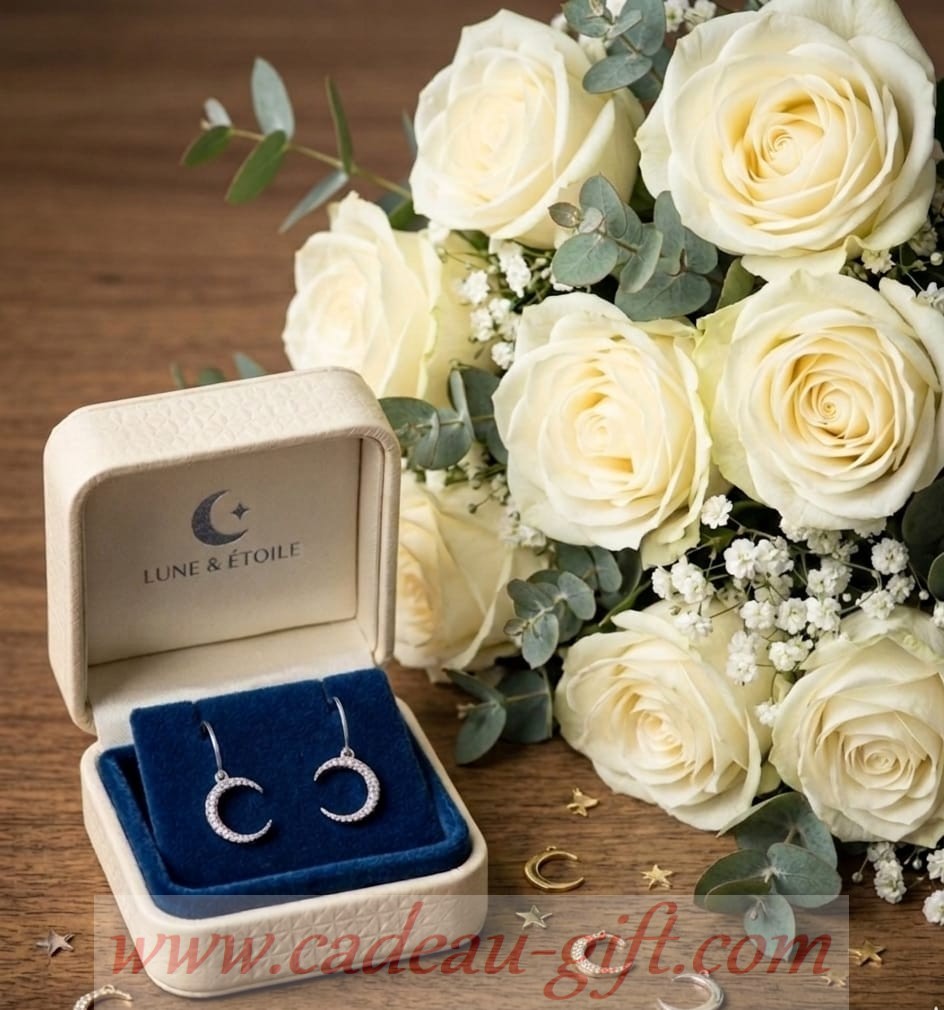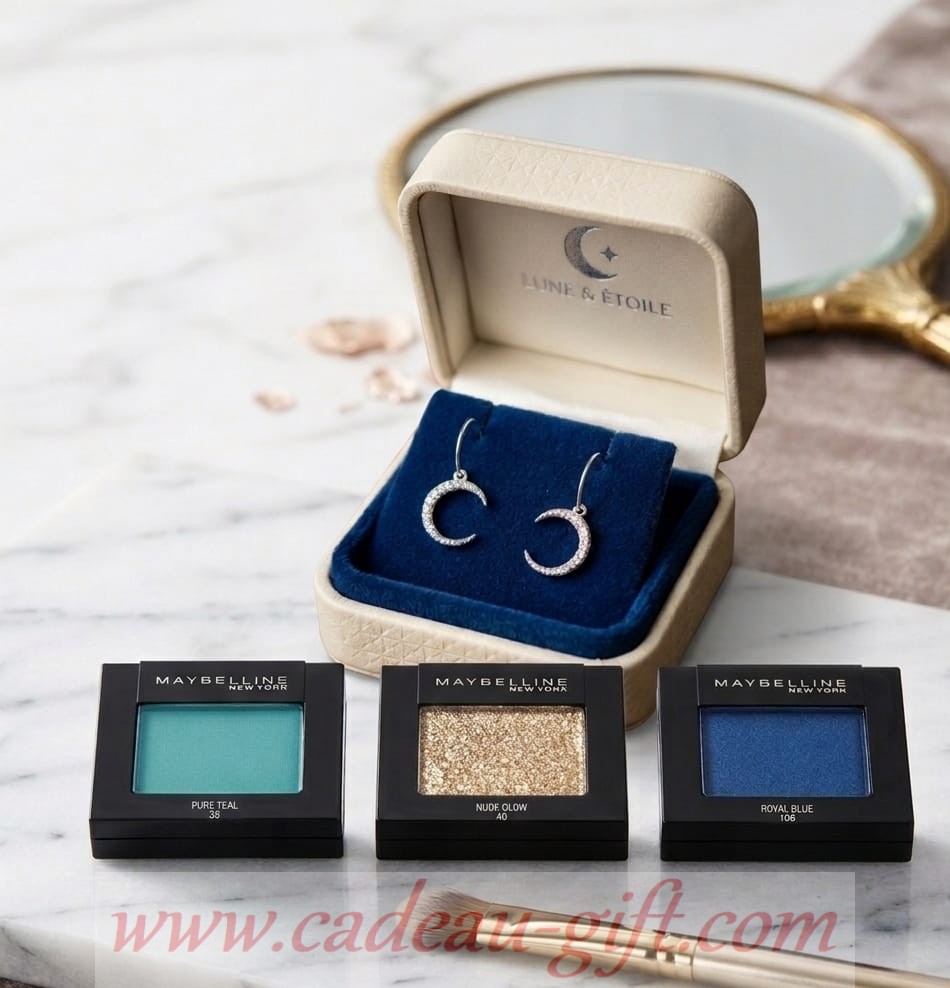 Pour cet instant magique et cette personne si lumineuse, offrez en cadeau ce “Coffret “Brille de mille feux” composé d’un trio de fards à paupières et une paire de boucles d’oreilles en forme de lune, en verre scintillant et alliage de zinc, finition argentée brillante.